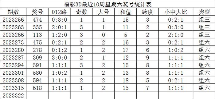 福彩3D最近10周星期六开出奖号鉴识为: